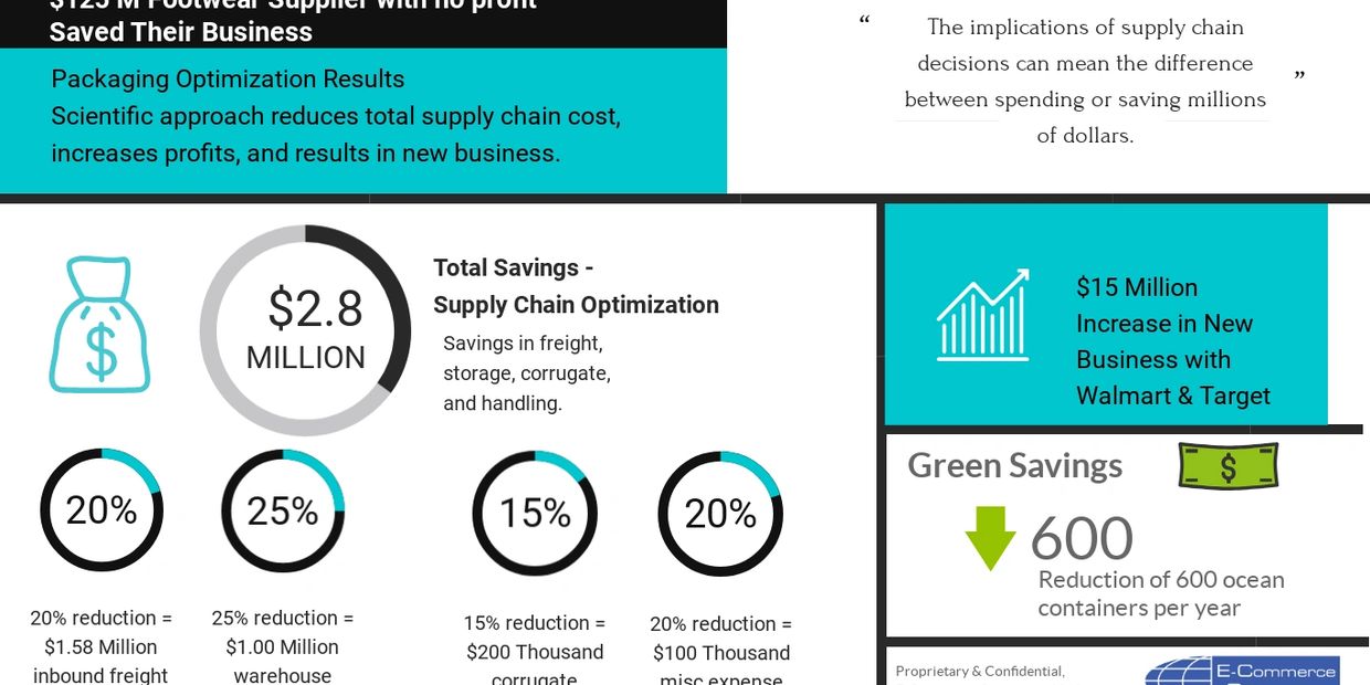 A footwear supplier used our packaging optimization software to improve payload on ocean containers eliminating 600 ocean containers from their supply chain. In addition, cost reductions were produced in storage, corrugate, and miscellaneous expenses. In total the client saved $2.8M in cost while reducing their carbon footprint. This resulted in $15M in new sales with Walmart & Target. The project turned the company to profitability.